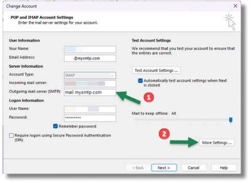 Klik OK og gå tilbage til vinduet med kontoindstillinger og klik på "Test kontoinstillinger...".
